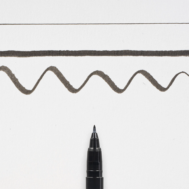 Pigma Brush Pen Fine Black má flexibilný hrot pre tenké a hrubé línie štetca. Mimoriadne odolný, trvanlivý a „pamätový“ hrot je vyrobený z pevného plastu. Odolné hroty štetiny okamžite reagujú na zmeny tlaku alebo smeru a dávajú hodvábne hladký, presný a konzistentný tok atramentu. Unikátny atrament Sakura Pigma ™ nebude prepúšťať papierom, je trvalý, vode odolný, odolný voči vyblednutiu, rýchlo schnúci a neutrálny voči pH.